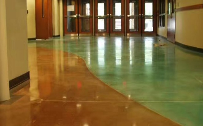 3、噴灑著色劑。著色前確保地面干凈清洗劑無殘留。把酸著色劑按照實驗的比例兌水,然后倒入噴霧器中,并將其按圓周運動的方法噴灑到地面上。在使用酸著色劑后,用長把毛刷清掃,以確保酸著色劑均勻涂抹。一般酸著色劑與水泥反應(yīng)時間在2至8小時左右,具體時間需要根據(jù)酸著色劑使用說明判斷。