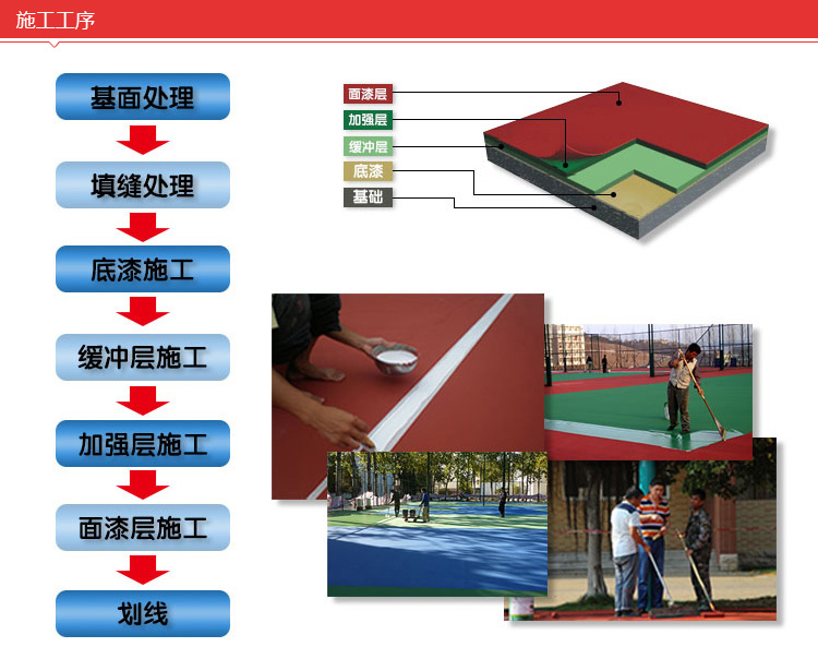 6、理想的綜合功能:適用于室內(nèi)外籃球場,網(wǎng)球場,排球場,羽毛球場,手球場,休閑場地,健身房等多項運動地面。
