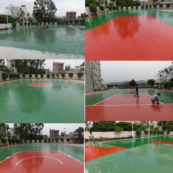 基礎(chǔ)要求平整度好,無裂縫、脫皮等情況,瀝青混凝土要求有足夠的強度及密實度。如是水泥混凝土基面的,要在其表面做一道底漆處理。新水泥基礎(chǔ)需在無降水天氣中曝曬20天以上,待水泥地中水份充分蒸發(fā);舊的水泥地面需進行打磨和平,保證地面光滑無粉塵,增強球場硅PU層與水泥地面的粘和性。